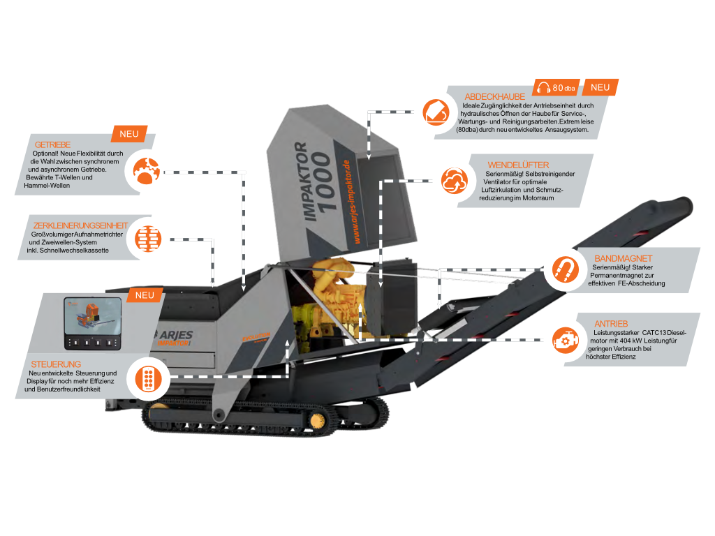 Der Impaktor 1000 steht für die nächste Generation leistungsstarker Zerkleinerung. Aufbauend auf dem Erfolg der Modelle 1250 und 850 kombiniert er maximale Effizienz, Flexibilität und Wartungsfreundlichkeit in einem kompakten Design.