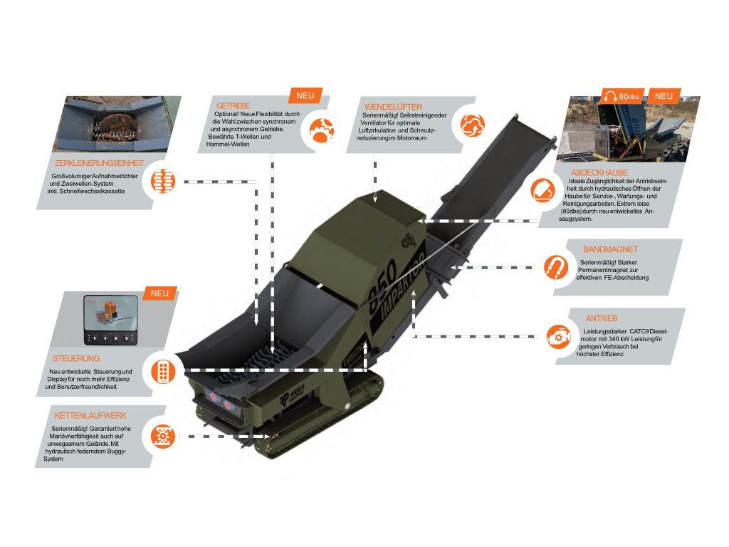 Der Impaktor 850 überzeugt als leistungsstarke Mittelklasse-Maschine für anspruchsvolle Zerkleinerungsaufgaben. Mit einem CAT C9 Motor (340 kW) und einem Trichtervolumen bis 8 m³ bietet er höchste Effizienz bei vielseitigen Einsätzen.